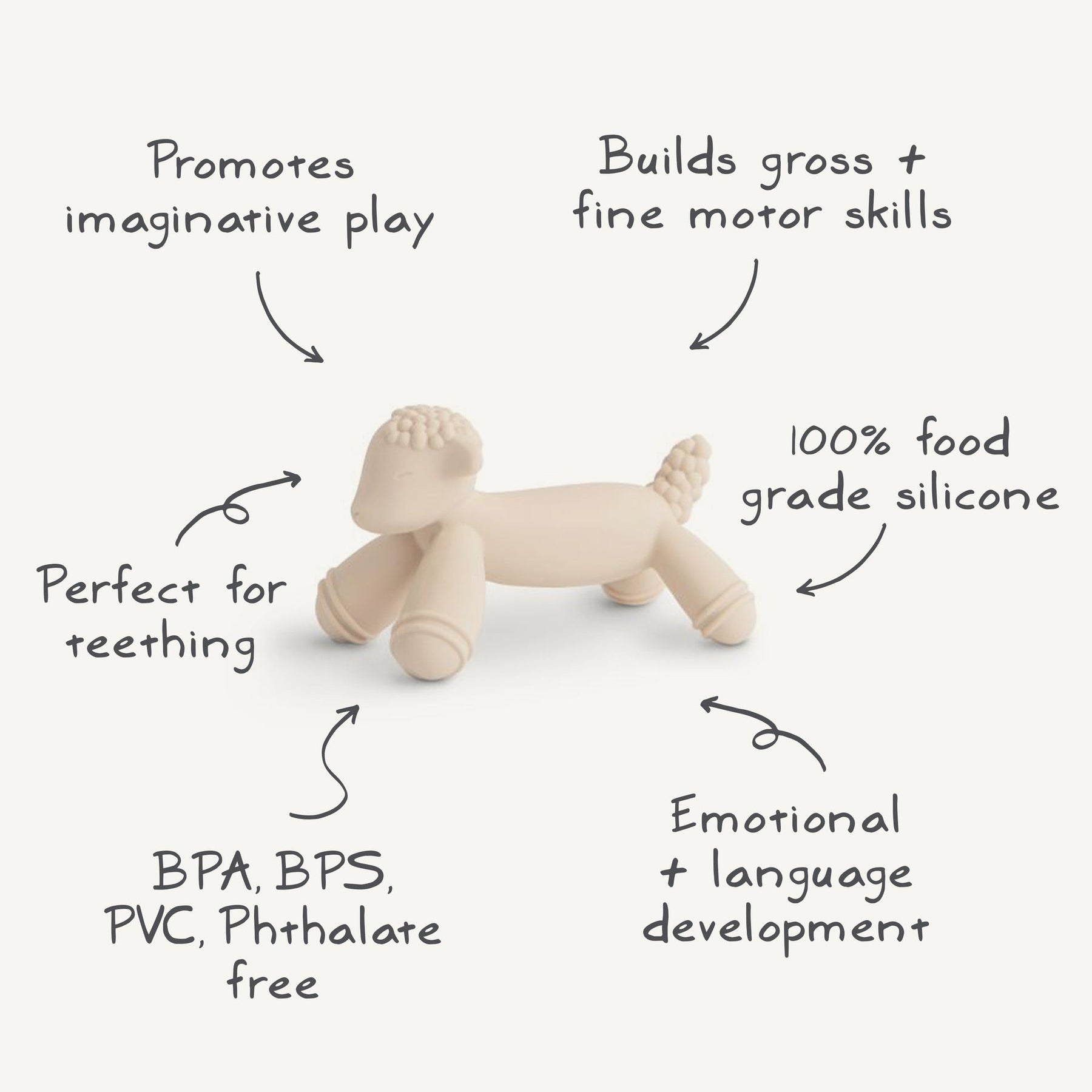 Shaped like a lovable animal friend and designed to soothe tender gums, our figurine teethers are both charming and functional. Made from non-toxic, food-grade silicone, these teethers are safe and gentle for baby's delicate gums. The playful design stimulates little imaginations and the compact size makes it easy for tiny hands to grasp, developing fine motor skills.