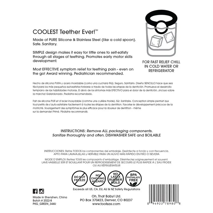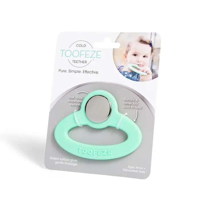 Simply the coolest baby teether ever. What makes toofeze so cool? Toofeze chills instantly in cold water to ease pain fast. Like a teaspoon with a baby-safe handle, toofeze is simply a new twist on an age-old teething remedy. All-natural food-grade ingredients meet the high standards of today's health- and eco-conscious families. The stainless steel disk satisfies babies' innate craving for cold, smooth objects. Its shiny surface creates a diversion that helps babies discover and admire their own reflection. The soft silicone handle has a smooth surface for firm even counter-pressure and a textured surface for gentle gum massage. Its compact stationary design encourages early motor skills development without frustration. An award-winning "parenting tool," toofeze enables babies to self-satisfy and self-manage their changing teething needs. Used, endorsed and recommended by pediatricians. Non-toxic, hypoallergenic - no paint, latex, phthalates, bpas, pcbs or choking hazards - no worries. Sanitize often and completely. Toofeze is a functional and durable teething solution. Take toofeze to your local engraver to create a special shower gift or unique keepsake.