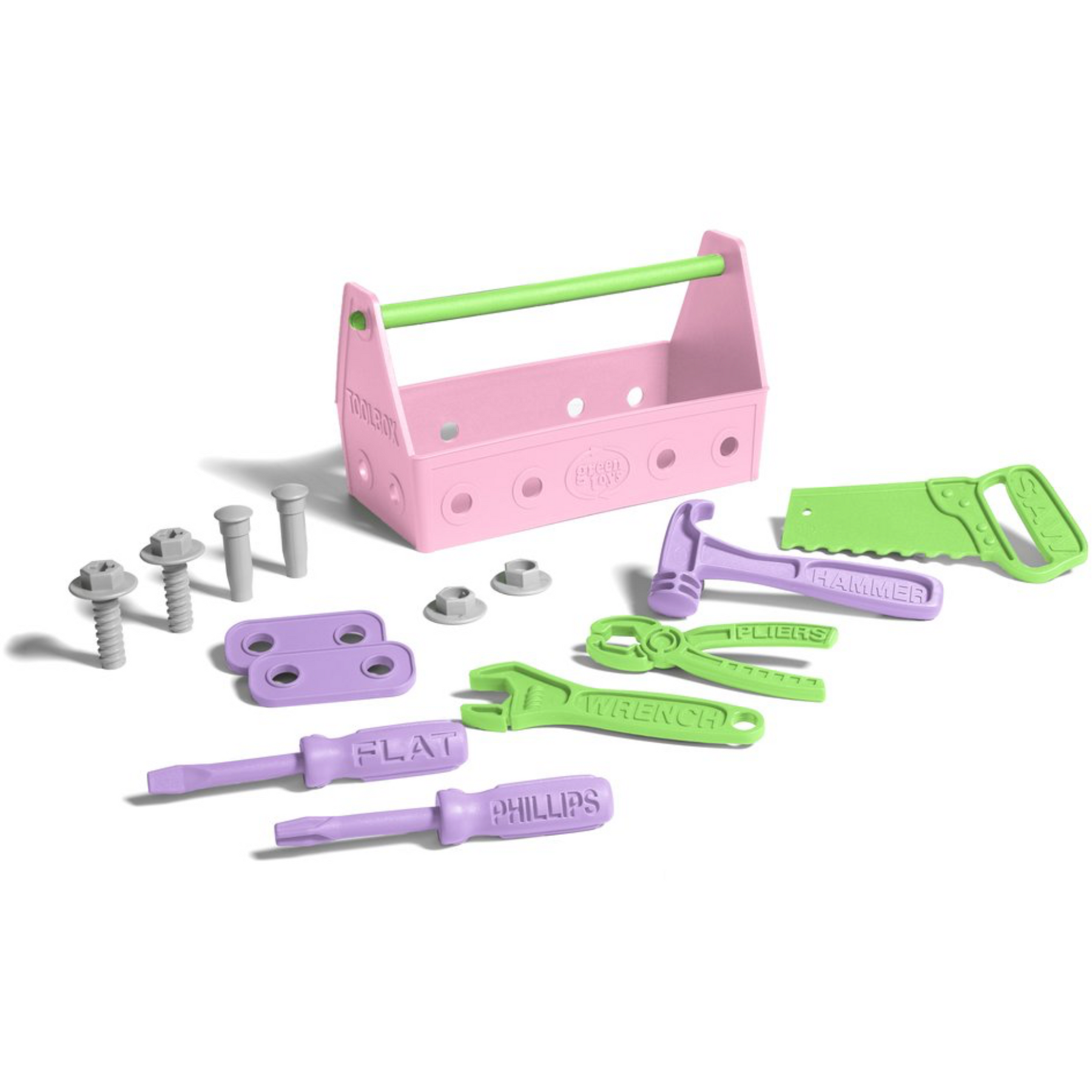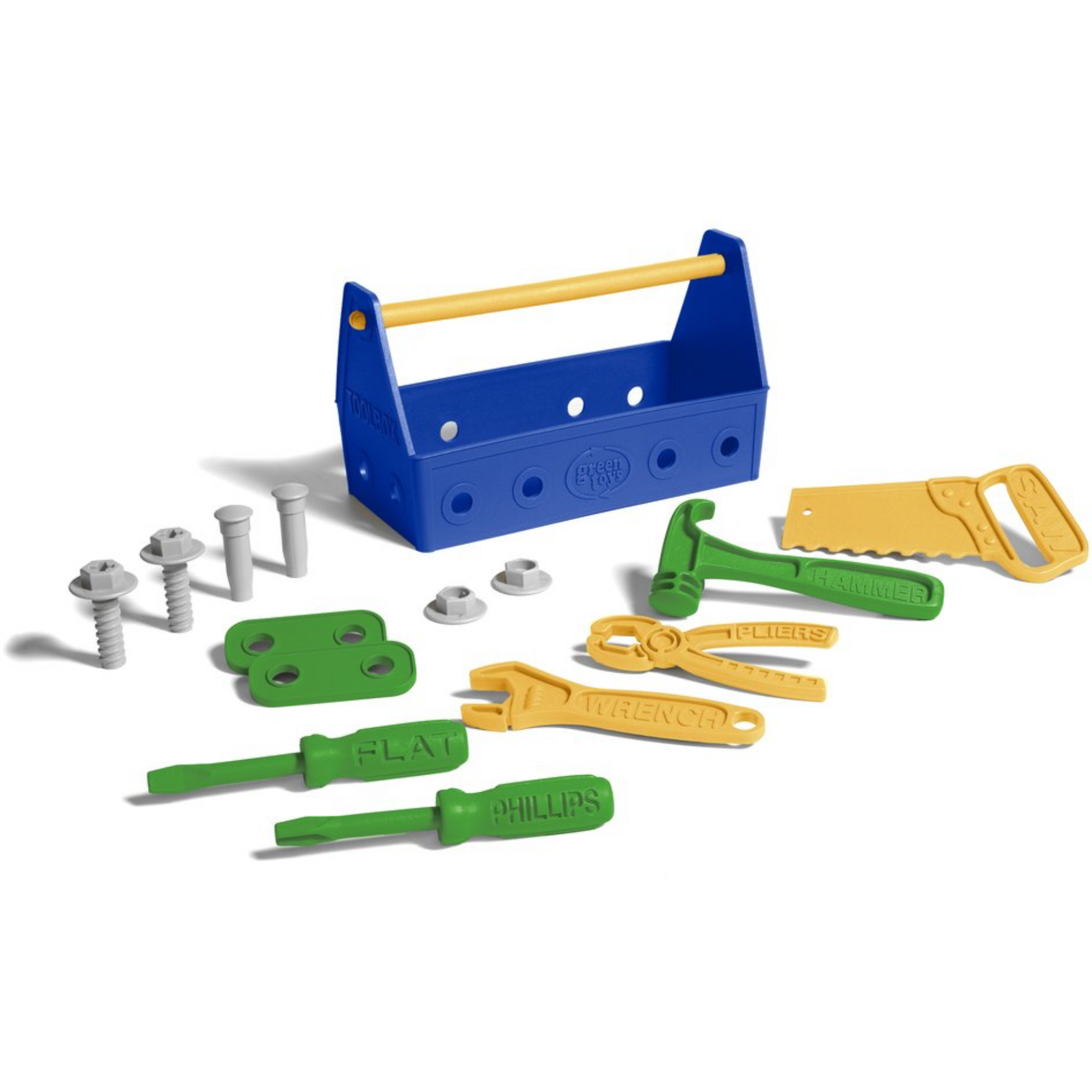 No job is too big for the world's most environmentally friendly tool kit! This awesome 15 piece set includes a tool box, phillips screwdriver, flat screwdriver, hammer, saw, wrench, pliers, 2 two-hole connectors, 2 nails, 2 bolts, and 2 nuts. The Green Toys™ Tool Kit turns work into Good Green Fun™!