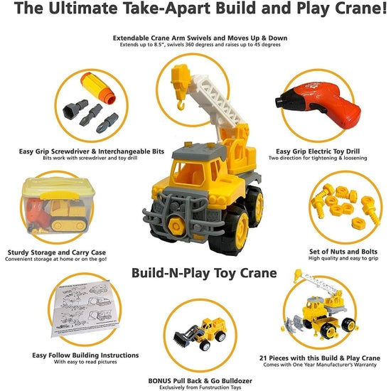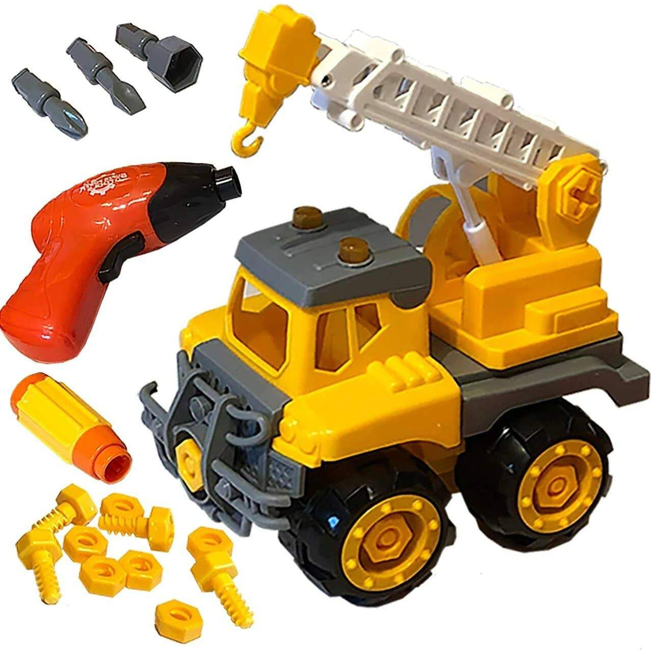 TAKE APART TOY WITH TOY TOOLS - This Tow Truck Crane Construction Toy is one of the best kids building toys around! The Toy Tool Set includes a toy electric drill, toy screwdriver and three bits to use with both! Includes a full set of nut and bolts too! TAKE A PART TOYS HELP BUILD CONFIDENCE - This toy truck is a wonderful gift when you're looking for toys for autistic children also. The parts are big enough to grip and the toy tools make putting the construction toy together a fun event. KIDS LOVE CONSTRUCTION TRUCKS! This toy crane has a working scoop! When you're looking for construction toys for 3 year old boys, look no further than this take apart car! STORAGE AND CARRY CASE INCLUDED! These put together toys for boys & girls are the hottest toys now. The case makes it easy for home or on the go fun! OUR BUILDING TOYS FOR KIDS help build confidence in your child so they can tackle anything that comes their way. These are perfect toy cranes for 4 year old boys & girls.
