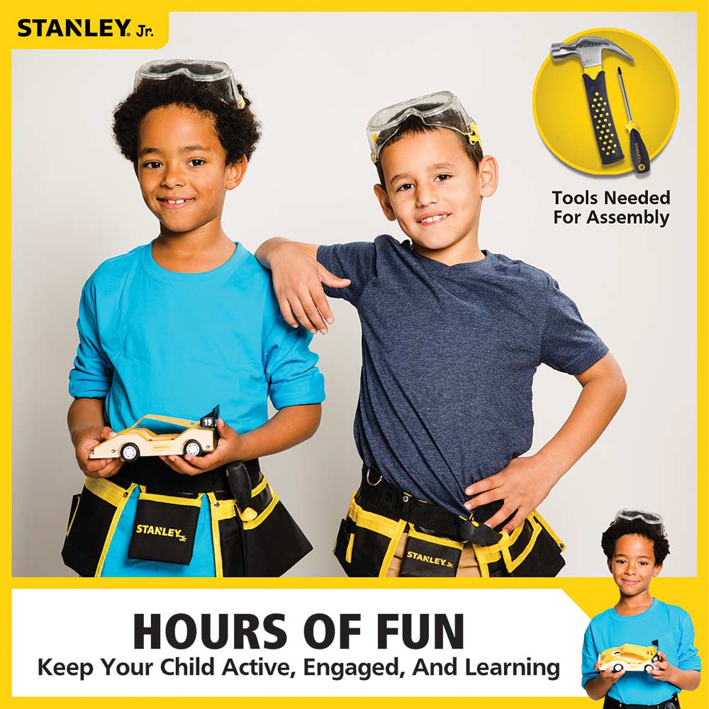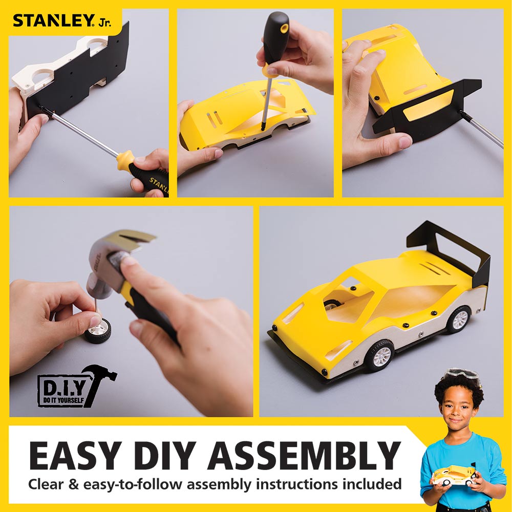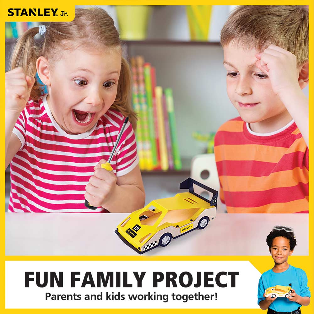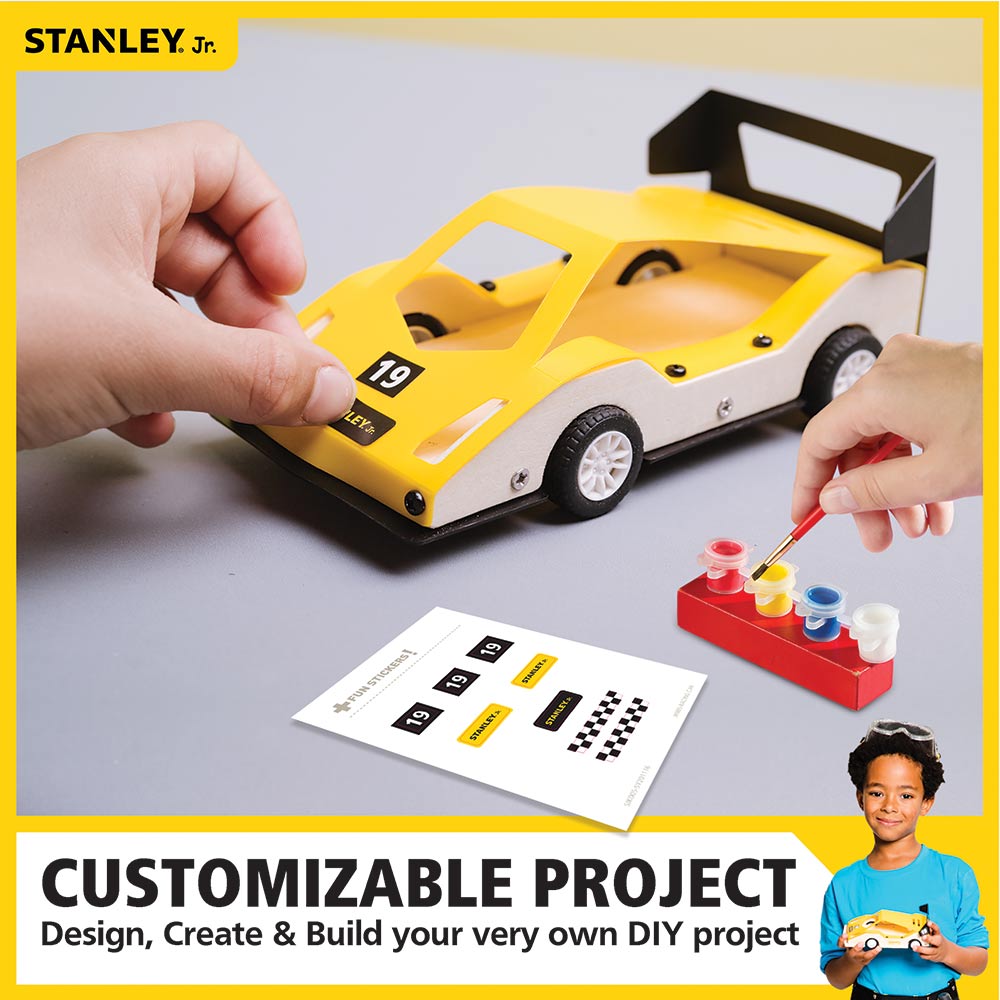 The Stanley Jr. Custom Racer Kit is for the race car drivers at heart. Little crafters will fall in love with their finished project and enjoy a sense of accomplishment when they play with a wooden toy race car that they have created using their own imagination and skill!
