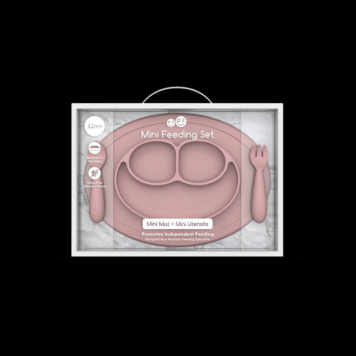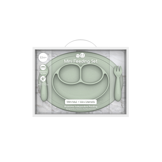 As infants transition to toddlerhood, they are ready to start practicing new mealtime milestones. They are eating a balanced meal with different food groups and are learning how to eat with a spoon (scooping) and fork (piercing). With the Mini Feeding Set ezpz provides all of the developmental tools you need for independent mealtime with your toddler. 12 months+ - Set includes [1] Mini Mat, [1] Mini Spoon and [1] Mini Fork - Helps your toddler succeed with feeding independence - Made from high quality silicone + nylon that is BPA, BPS, PVC and phthalate free - Dishwasher safe