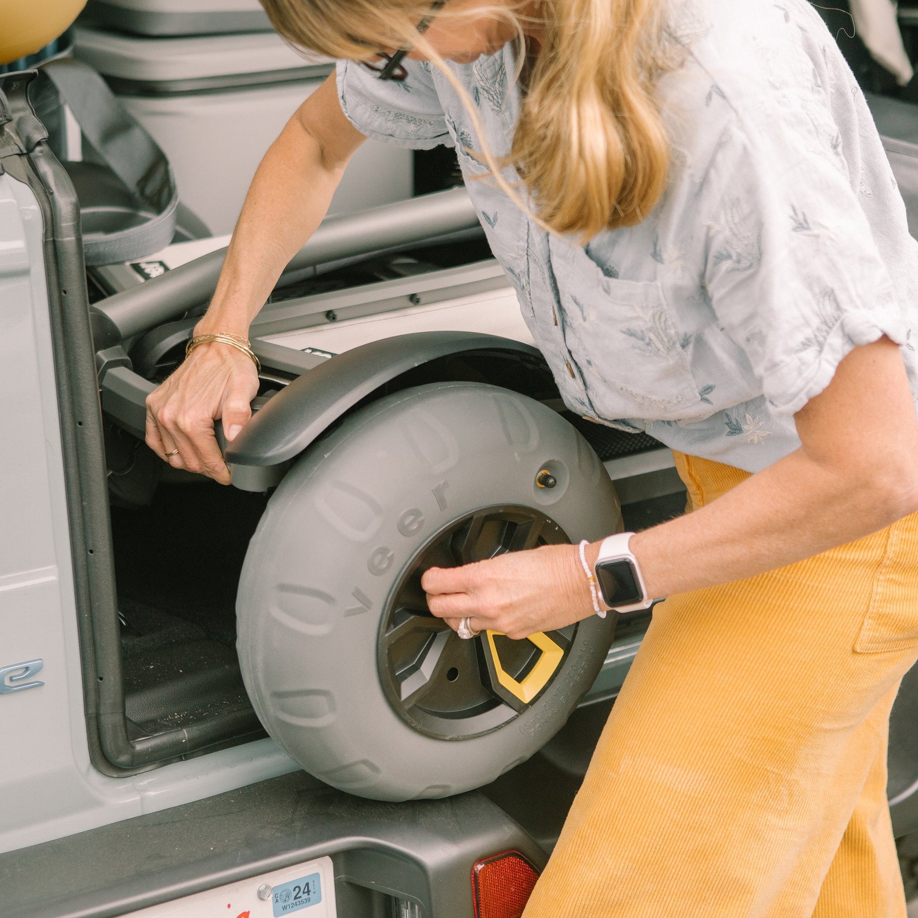 Make the beach journey with kids and gear over sand a breeze with the Beach Wheel Kit for any Veer wagon. This kit allows you to swap out your standard all-terrain wheels with the push of a button. Designed only for pull mode, the Beach Wheels can be attached to any size All-Terrain Cruiser or Cruiser City.