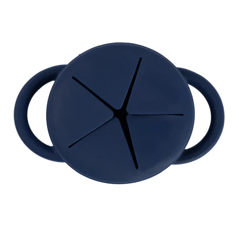 The Happy Snacker is a first-of-its-kind two-piece silicone snack cup with a mess-proof snap-tight lid and soft silicone opening so little hands can easily access food and prevent spills. Designed with easy-grip handles, it fits in car seats and stroller cup holders.
