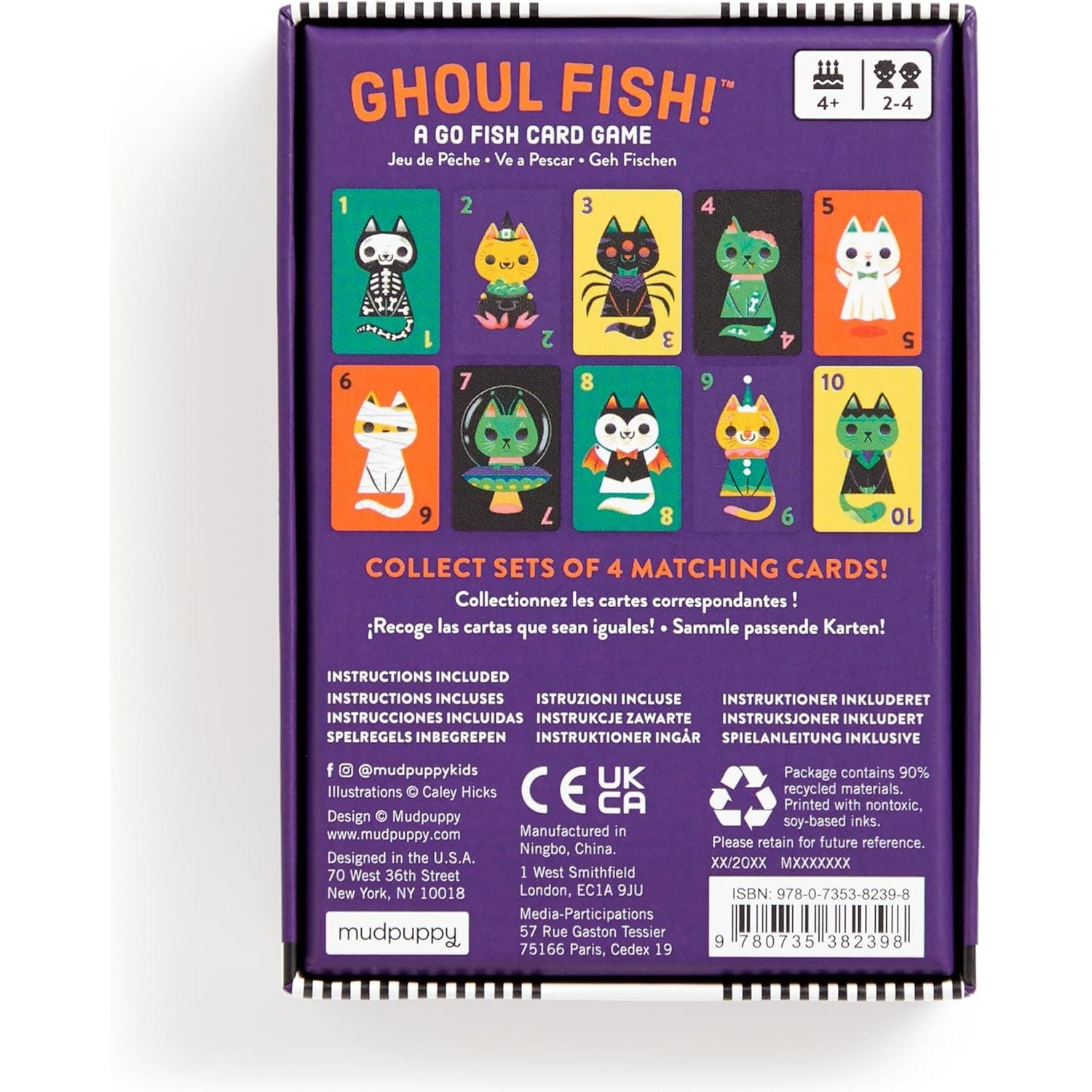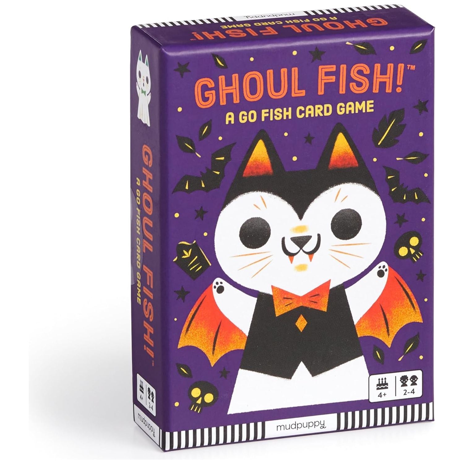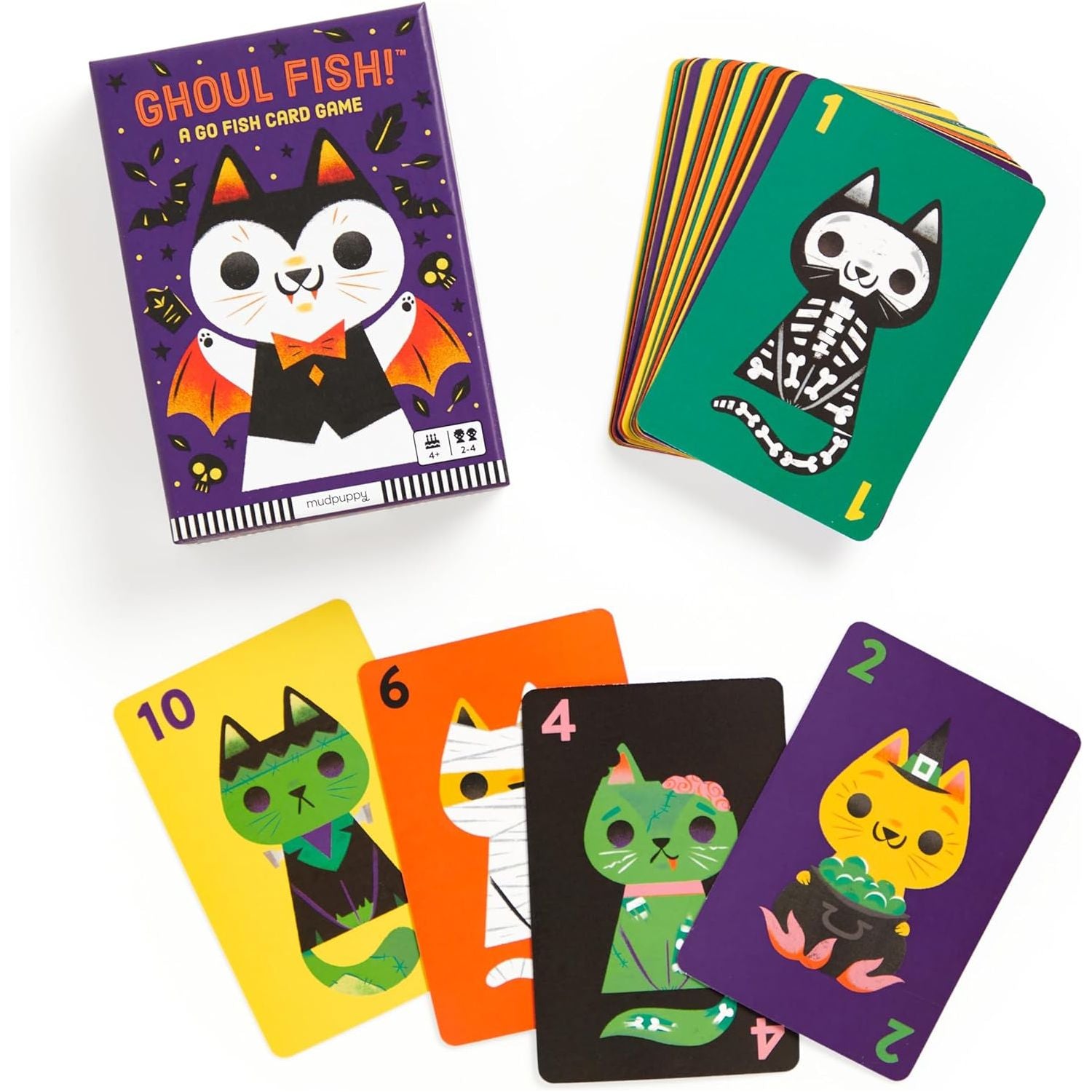 GHOUL FISH! CARD GAME – Ghoul Fish! from Mudpuppy is a spooky spin on the classic game of Go Fish. Collect the most sets of 4 matching cats to win a purr-fect game for Halloween boo baskets!