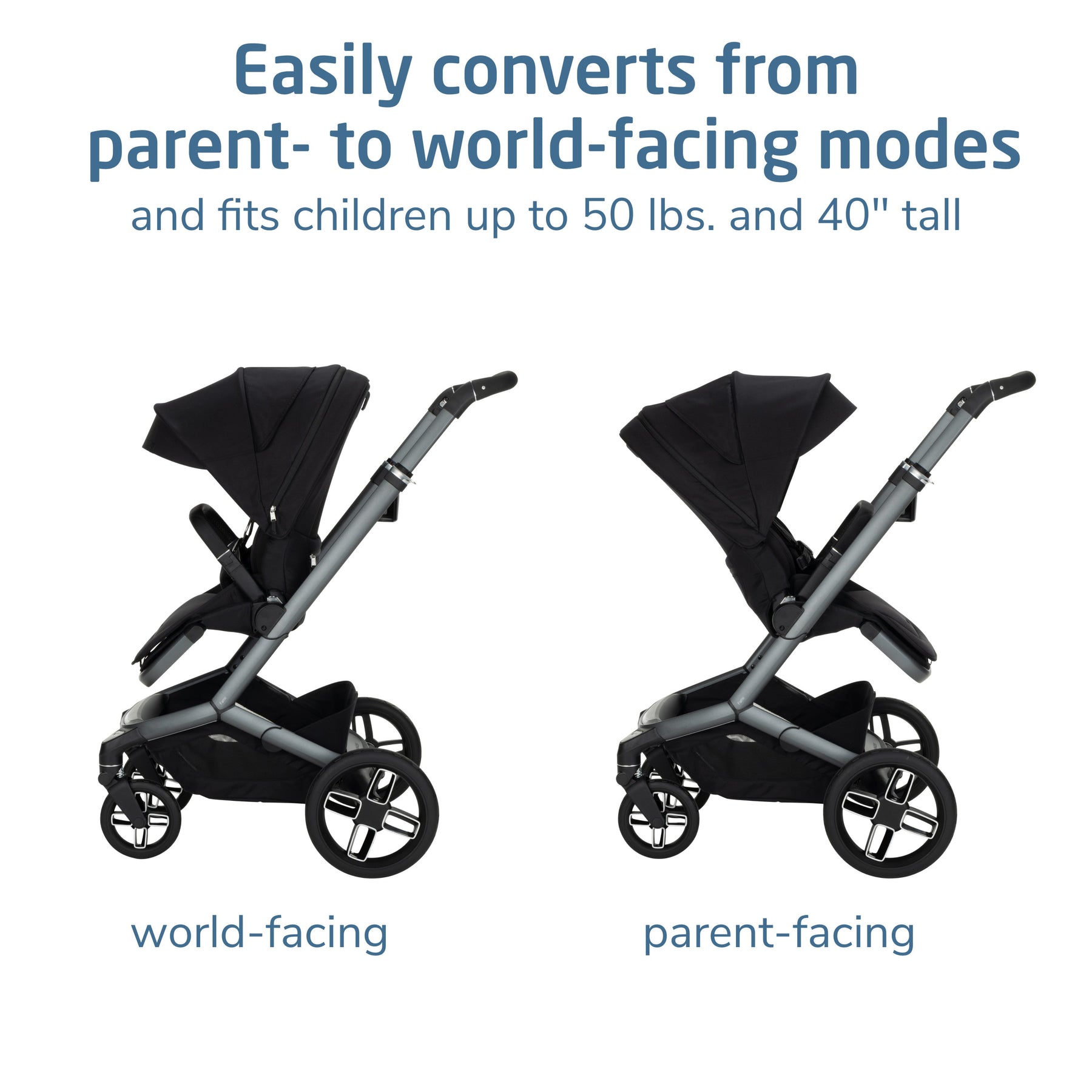 • Innovative, luxurious, fashion-forward stroller easily converts from parent- to world-facing modes and fits children up to 50 lbs. and 40" tall