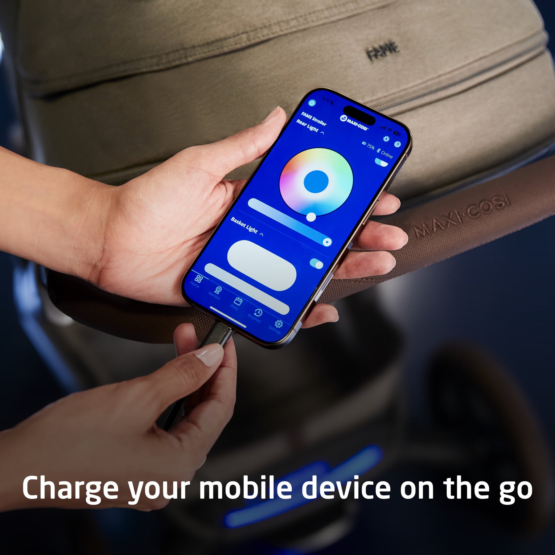 This innovative stroller is equipped with the Maxi-Cosi LumiRide system––integrated LED lights on the frame  and storage basket that illuminate dimly lit pathways so you can see where you’re going, and others can see you. Use the Connected Family app to control and adjust the lights, including color and brightness. Because convenience and accessibility are important, you can charge your mobile device on the go with the easy-to-access USB-C port.