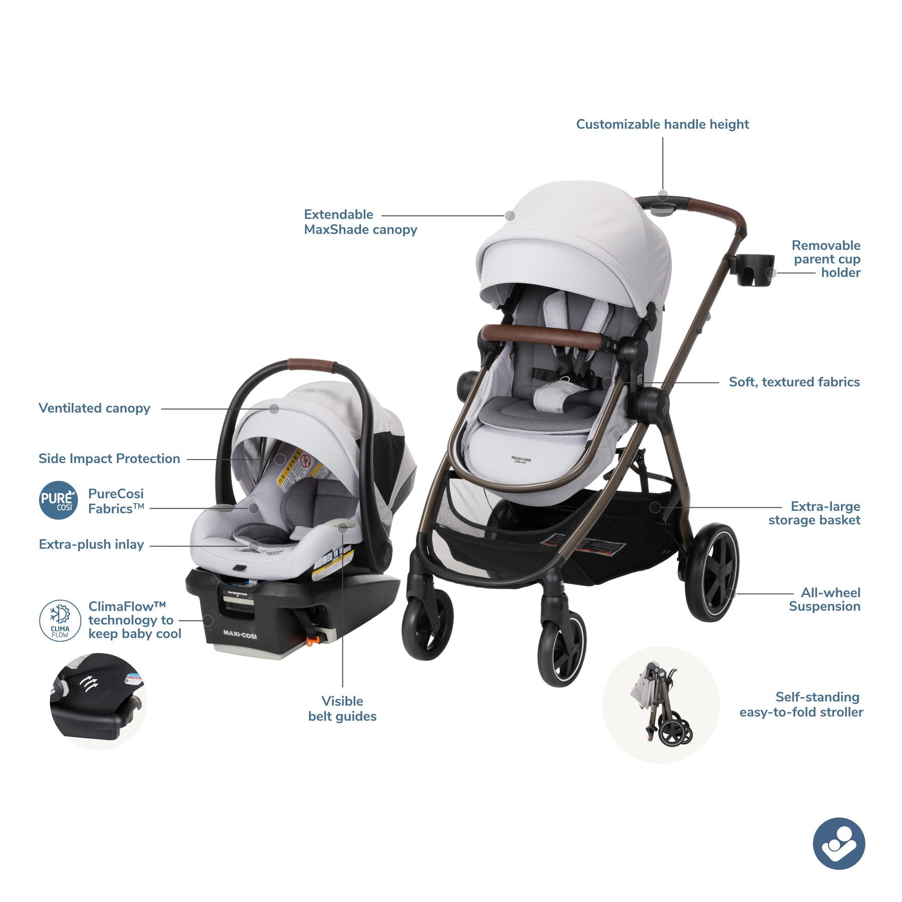 The lightweight Maxi-Cosi Mico™ Luxe+ Infant Car Seat is included. Designed to keep baby cozy, it features removable plush infant inserts, and premium PureCosi™ fabric made without wool or added fire retardant treatment. Plus, the shell is designed with our innovative ClimaFlow™ technology to help keep your baby cooler.
