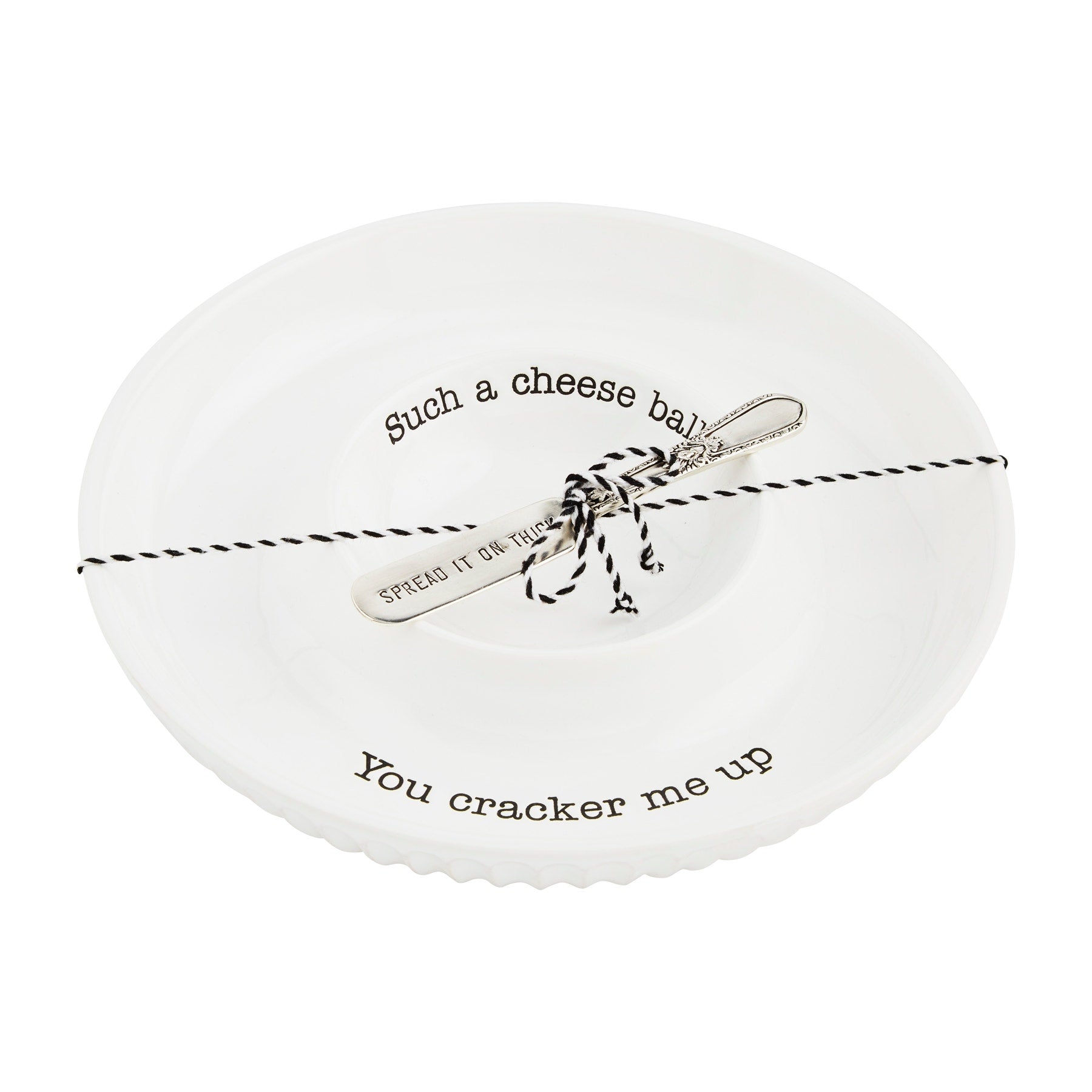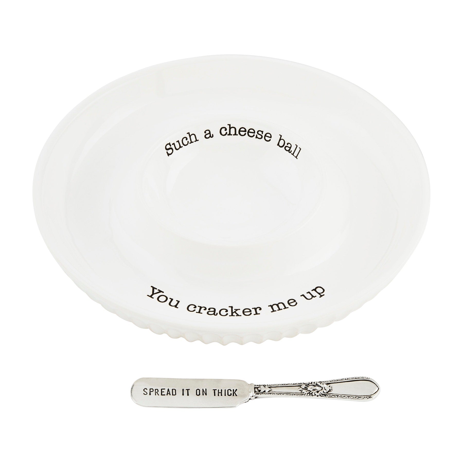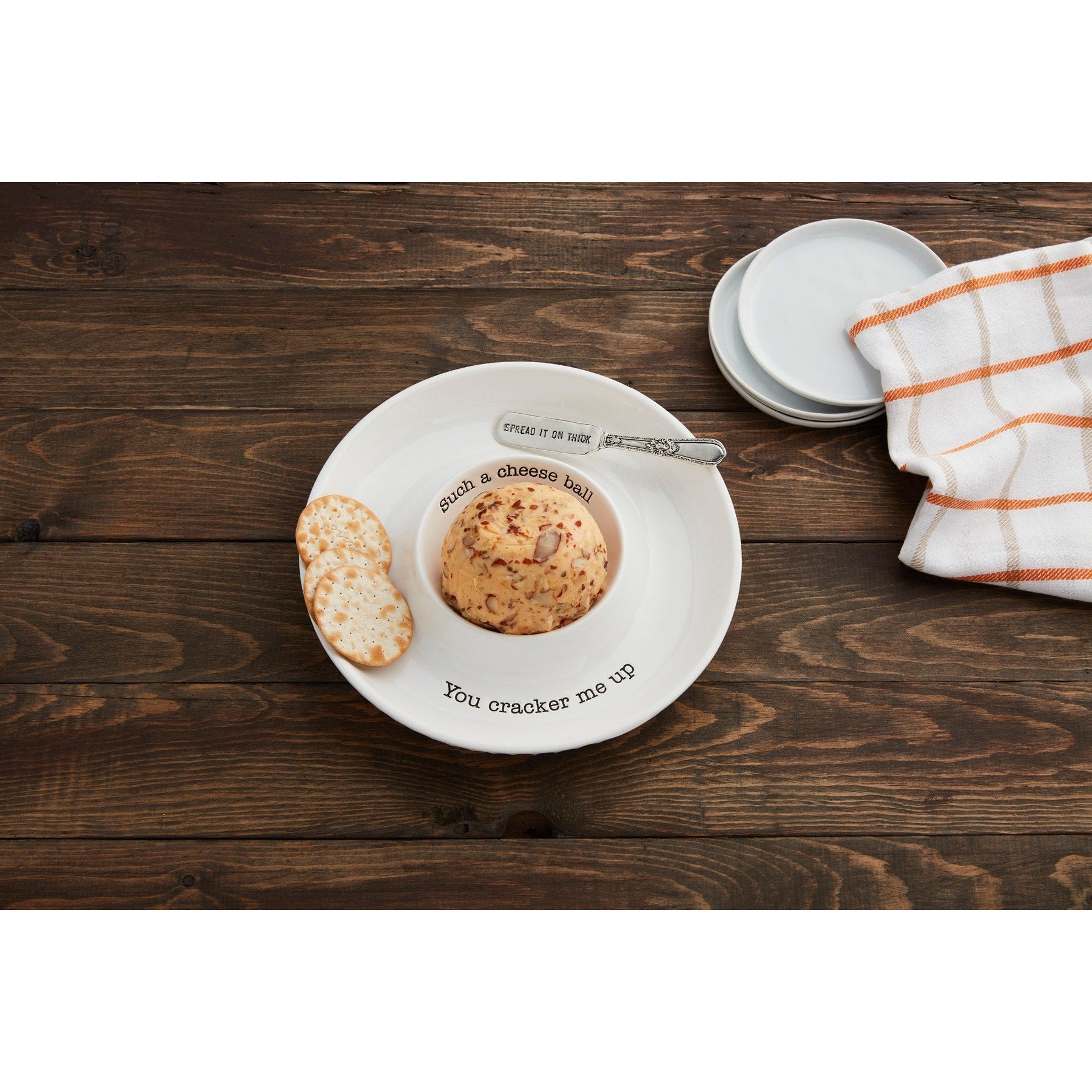 Spread it on thick with this cheese ball serving dish set. The two piece set comes with a ceramic cracker dish. The dish surrounds a center well to hold a cheese ball. The dish features the phrasing "You cracker me up" and "Such a cheese ball". The tray comes with a silver-plate spreader that reads "Spread it on thick."