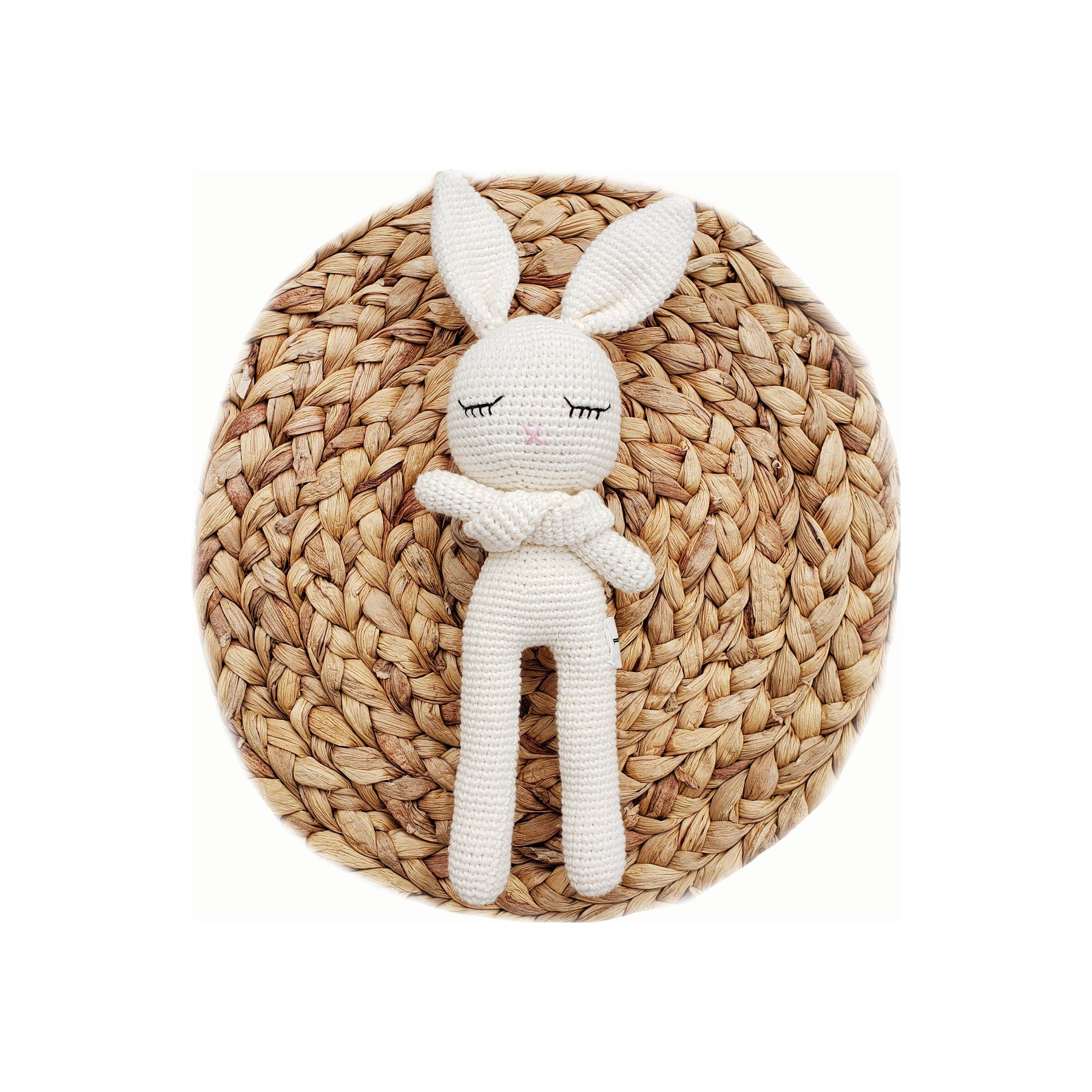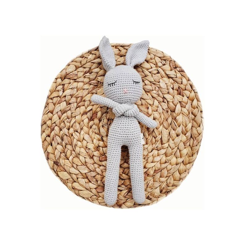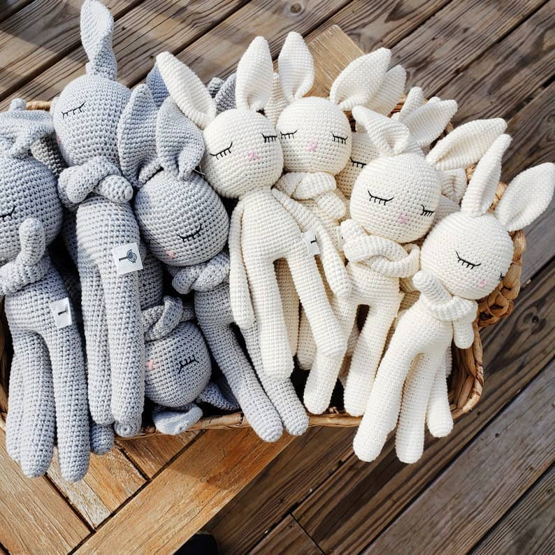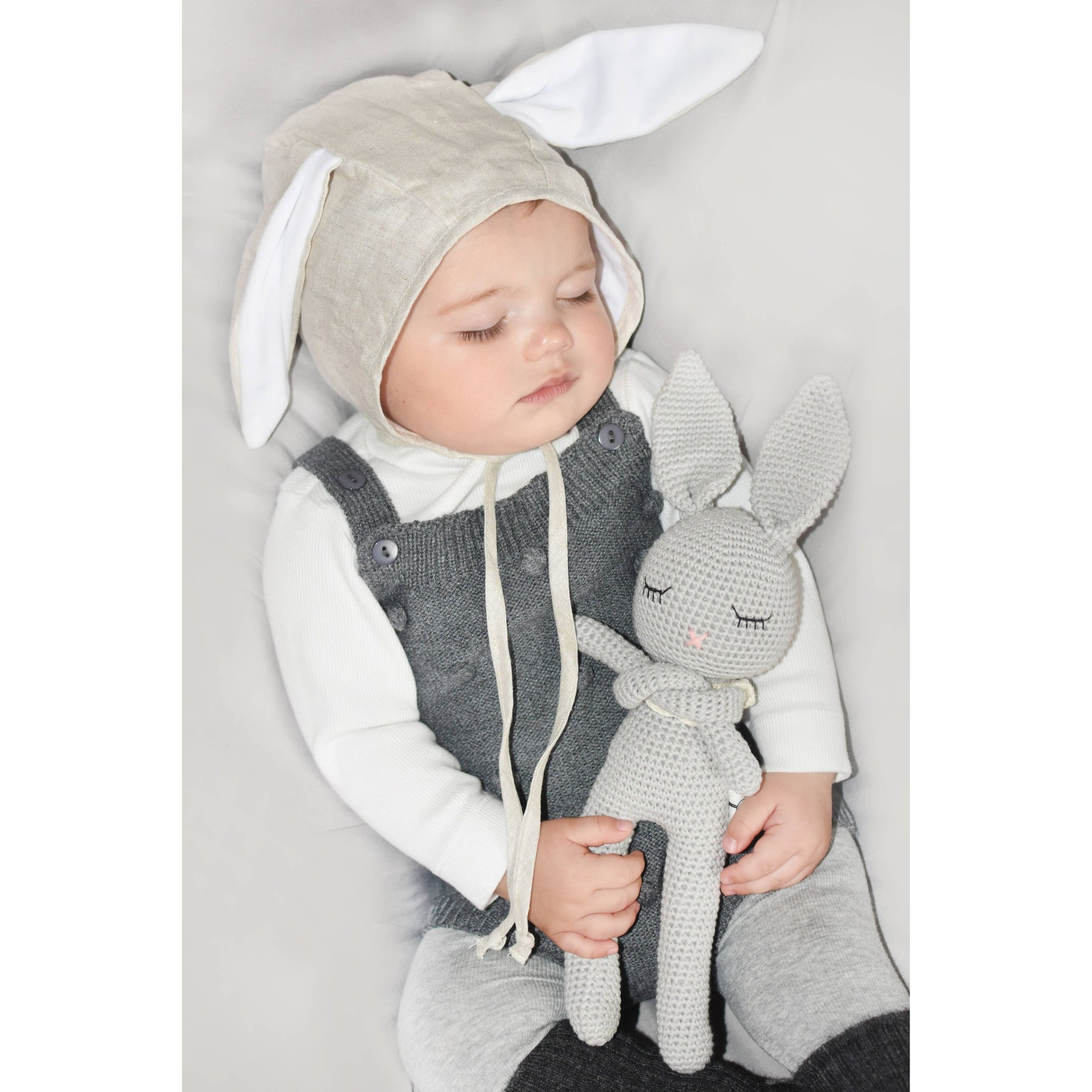 Cotton crochet sleepy head bunny doll with rattle and crinkle ears gray. Handmade bunny dolls measuring 12-13inches tall.